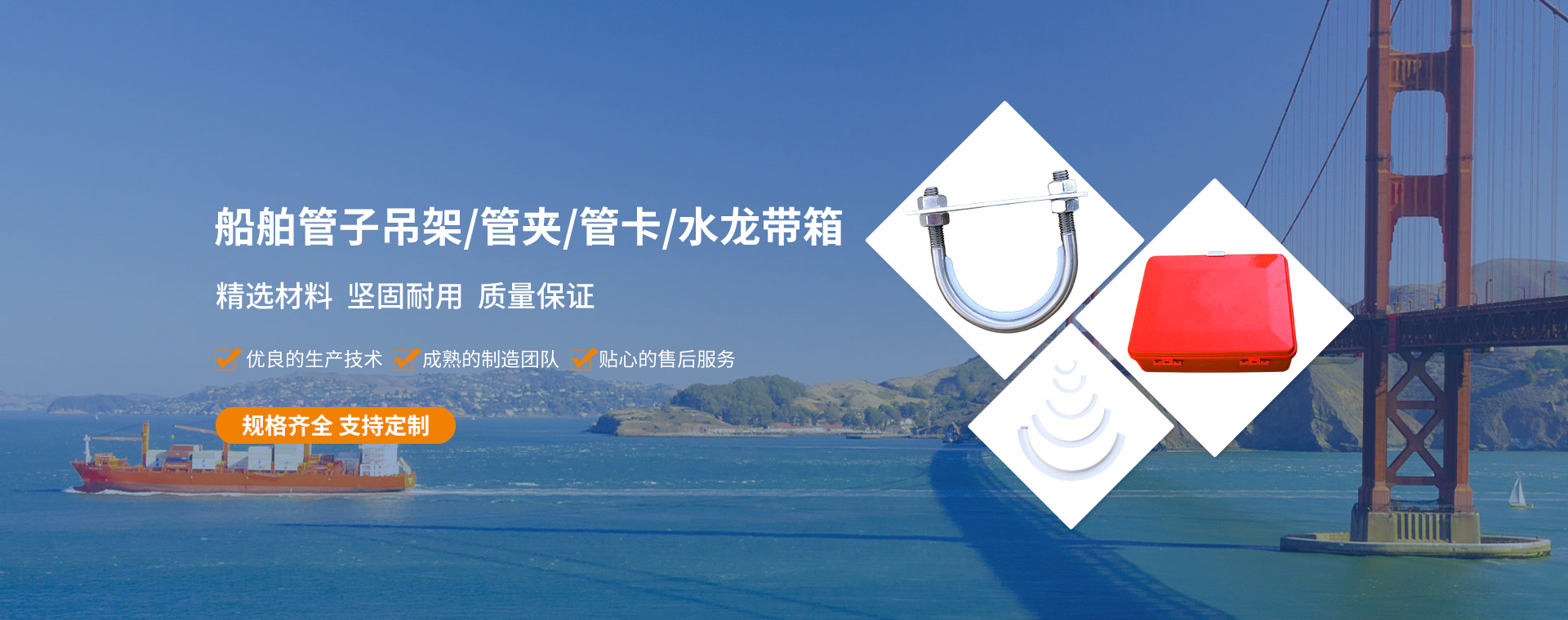 公司主要生产船舶管子吊架、四氟垫板、垫块、管卡四氟套管、船舶水龙带箱、工业插座箱;桥架、母线、配电柜等产品,是集产品开发、生产、销售和工程服务为一体的企业。